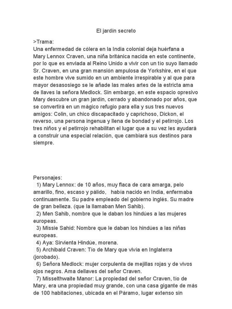 El Jardin Secreto Personajes Resumen Y Autor El Jardin Secreto from imgv2-2-f.scribdassets.com Por ese entonces ya había pasado varios años en italia estudiando arte, lo que sin duda influyó en su gusto por el detalle del espacio dentro del cual se mueven sus personajes. Romanización revisada del coreano, sikeurit gadeun), también conocido como secret garden, es una serie de televisión surcoreana de fantasía transmitida en su país de origen por sbs desde el 13 de noviembre de 2010 hasta el 16 de enero de 2011, centrándose en el romance entre un traumático ceo de una cadena de almacenes y una esforzada joven. Además de un proveedor de servicios profesionales de locución. El juego del alma, de próxima publicación, será su quinta novela. Ferias pospuestas, novedades canceladas o postergadas y con el cierre echado en las librerías hasta n Aunque parece que no es un gran personaje en el libro, este pájaro es el mejor amigo de ben y mary. Tras la publicación en 1936 del libro de sonetos a la orilla de un pozo, la guerra civil la llevó a exiliarse en buenos aires. El libro #1 de finanzas personales.
